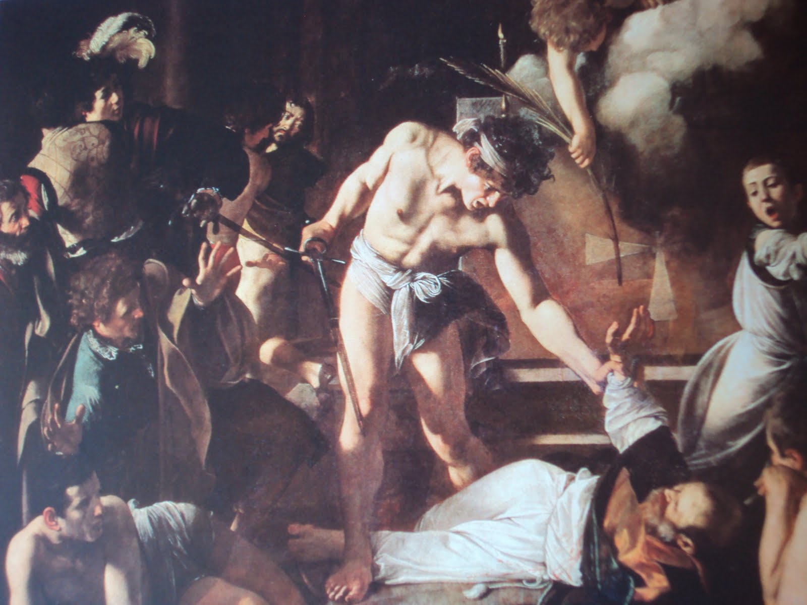 The Martrydom of St. Matthew is full of figures, quite confusing, and amazingly was painted directly without even a drawing! Matthew is on the floor fully dressed in what appears to be a monk’s robe, one arm raised to the soldier? .... executioner?, who is clothed in a loincloth. Matthew’s face is not visible. They are surrounded by horrified people, as seen by their facial expressions and body language. And an angel from above is handing the “palm of martyrdom” to Matthew. The light from top right shines fully on the soldier, giving his skin an ivory tone while the same light intensifies the whiteness of St. Matthew’s robes. The spectators are in shadow.