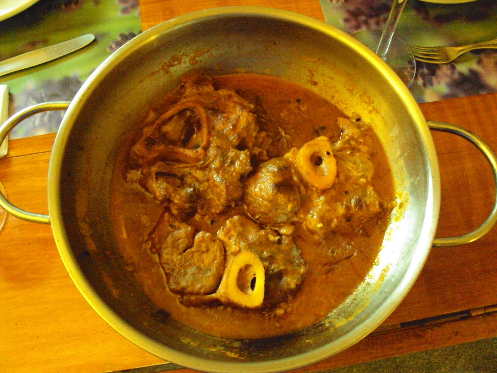 The first thing I tried was osso bucco. I tried cooking this in two ways: I tried a recipe by Guida de Laurentiis, which I found on the internet. The important ingredients, the veal shanks and the white wine, but the recipe also called for onions, garlic, carrots, celery, a bouquet garni of rosemary, thyme, bay leaves and cloves, the dredging with flour.... you get the idea This involved a lot of work and ingredients, I’m not too fond of chopping, dicing mincing etc. which adds to the clean up after, which is also tedious and boring. My complaints aside, it was pretty good and my husband enjoyed it. But it was too labour-intensive for me.